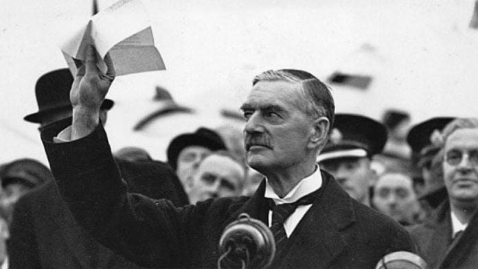 Chamberlain a Londres, tras el acuerdo de Múnich, éste sería aclamado por el